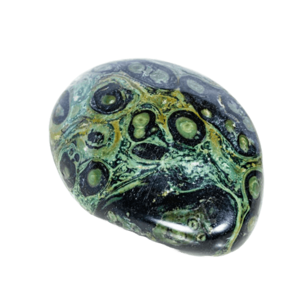 Properties Kambaba jasper is a green and black orbicular stone with swirled, fossil-like patterns. It resonates with the heart and root chakras, encouraging emotional stability and a strong connection to nature.