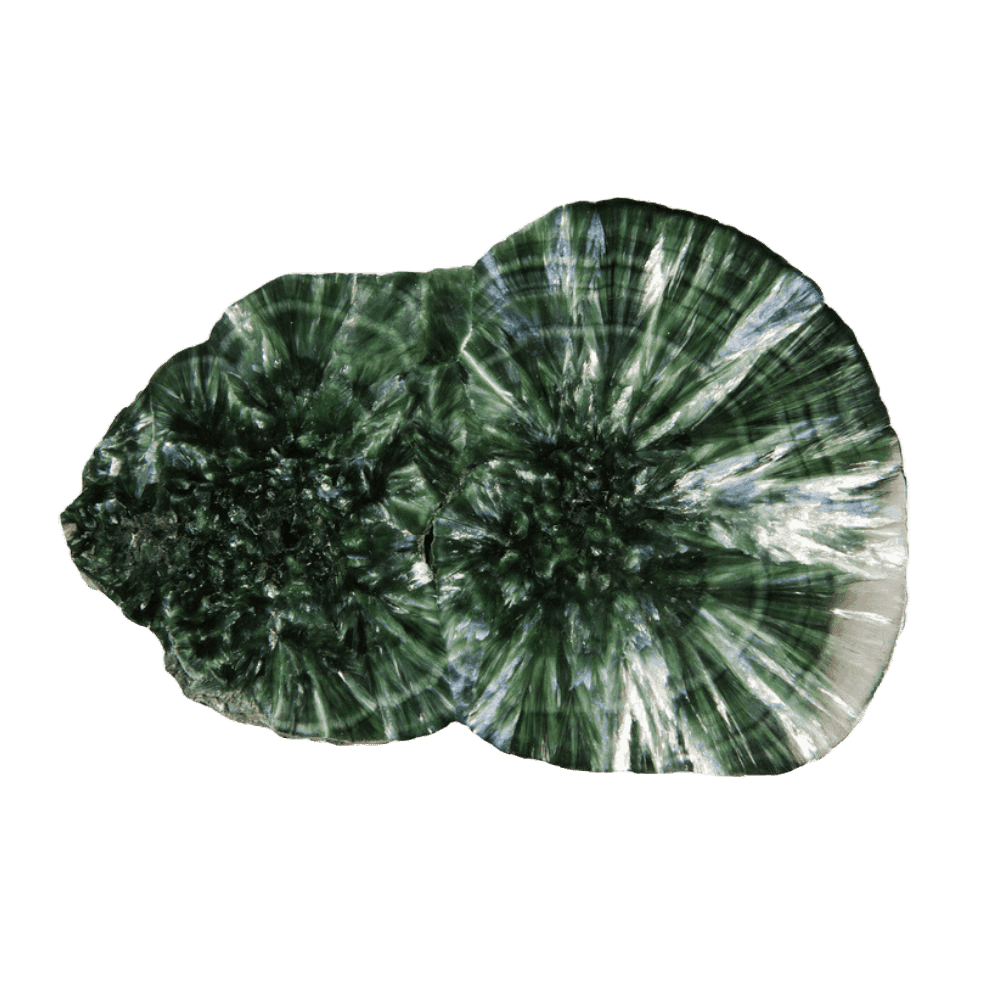 Properties Seraphinite is a deep green stone with shimmering silver feathery patterns. It resonates with the heart and crown chakras, facilitating spiritual enlightenment.