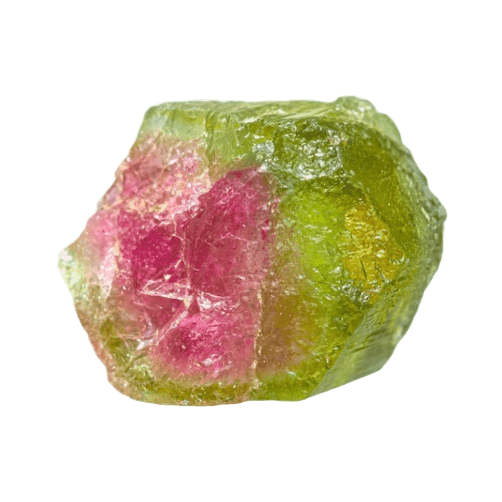 Properties Watermelon Tourmaline features a pink center surrounded by a green outer layer, resembling a watermelon slice. It resonates with both the heart and higher heart chakras.